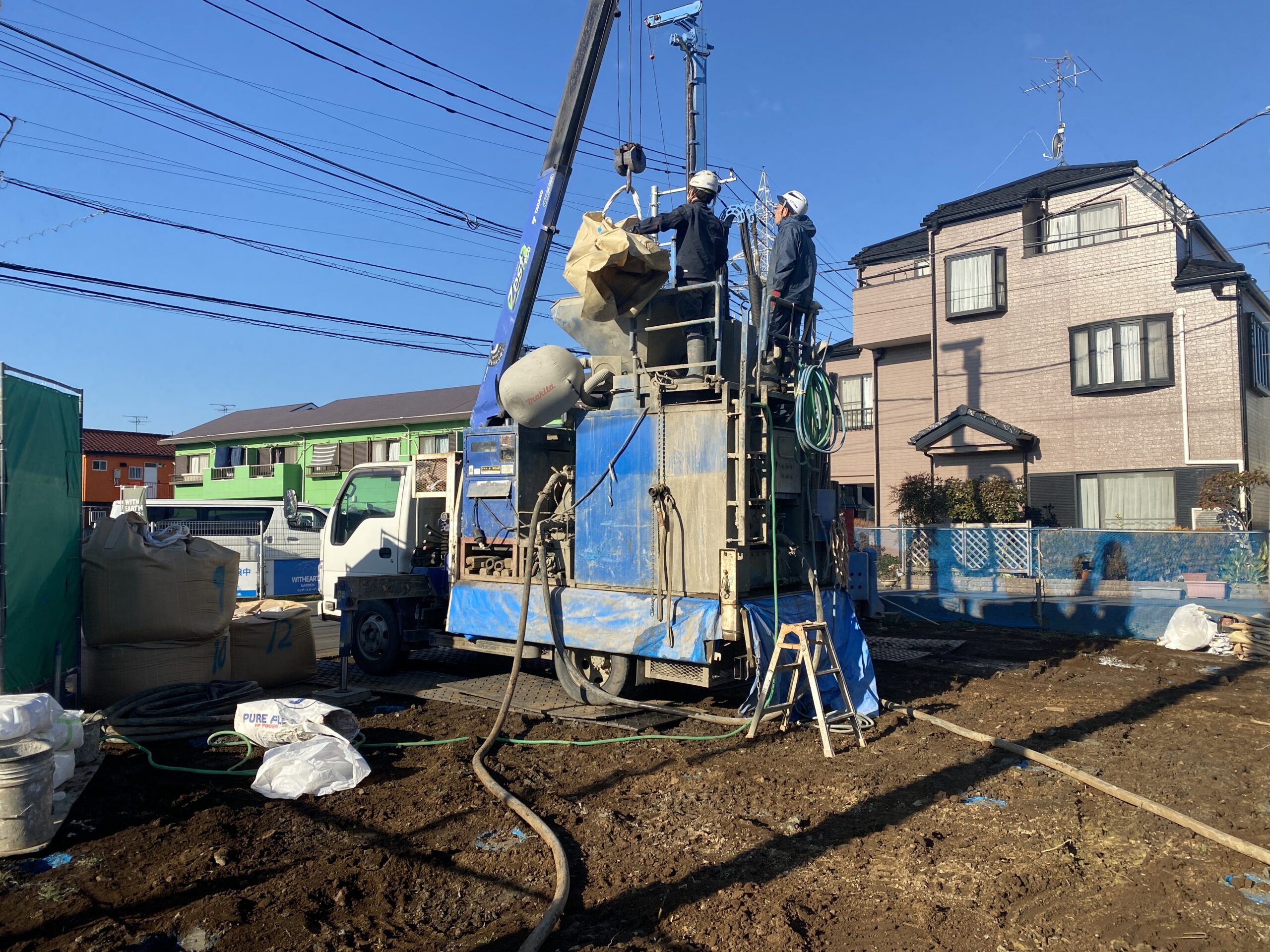 写真の通り、最初に行われる工事は『地盤改良工事』。