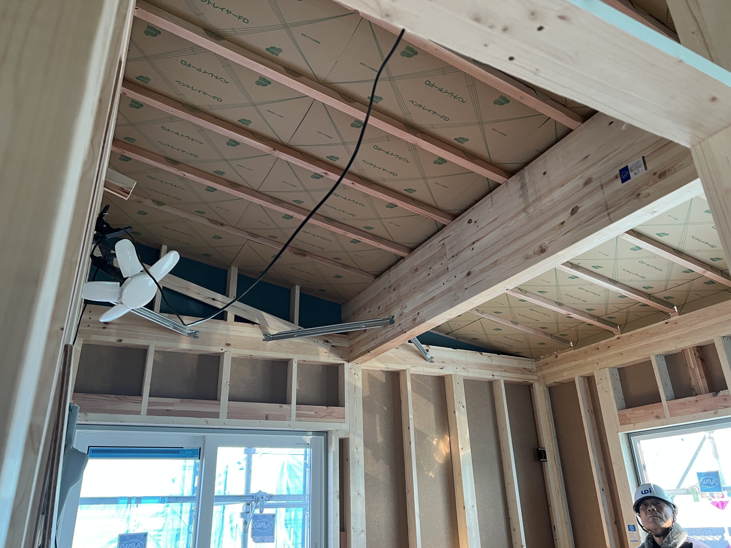工事途中の柱や梁(テクノビーム等)、またもっこもこの断熱材が
