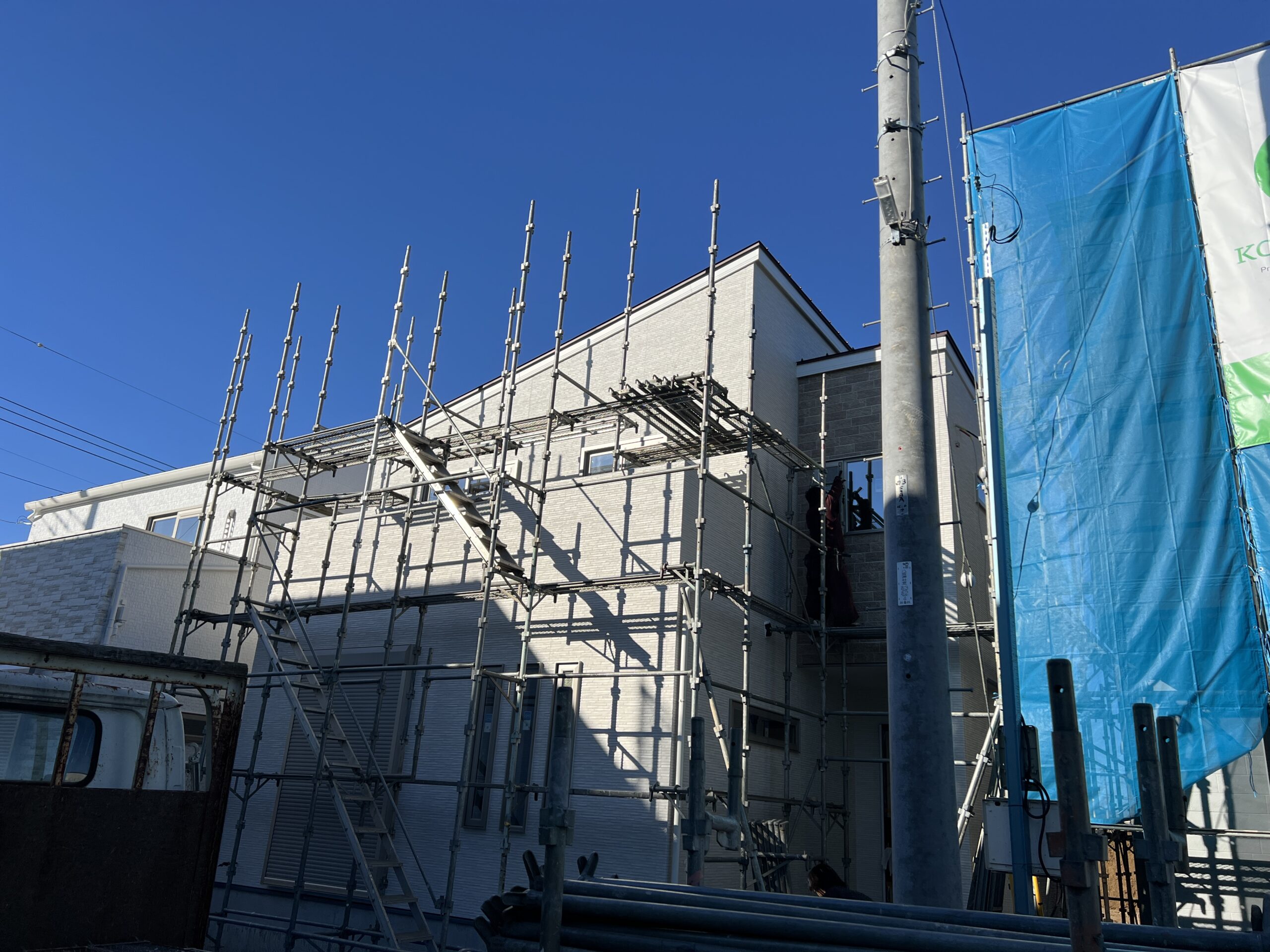 丁度足場が解体されている現場もあれば